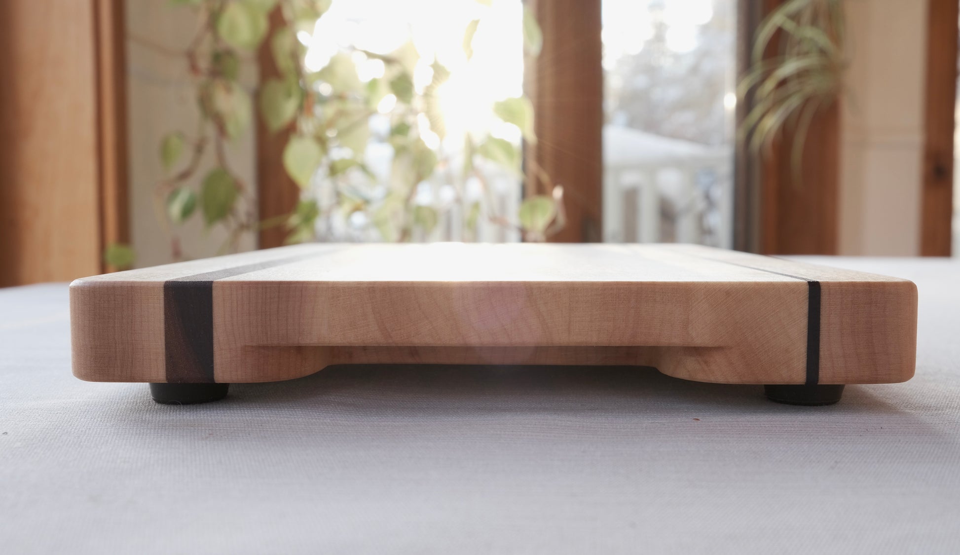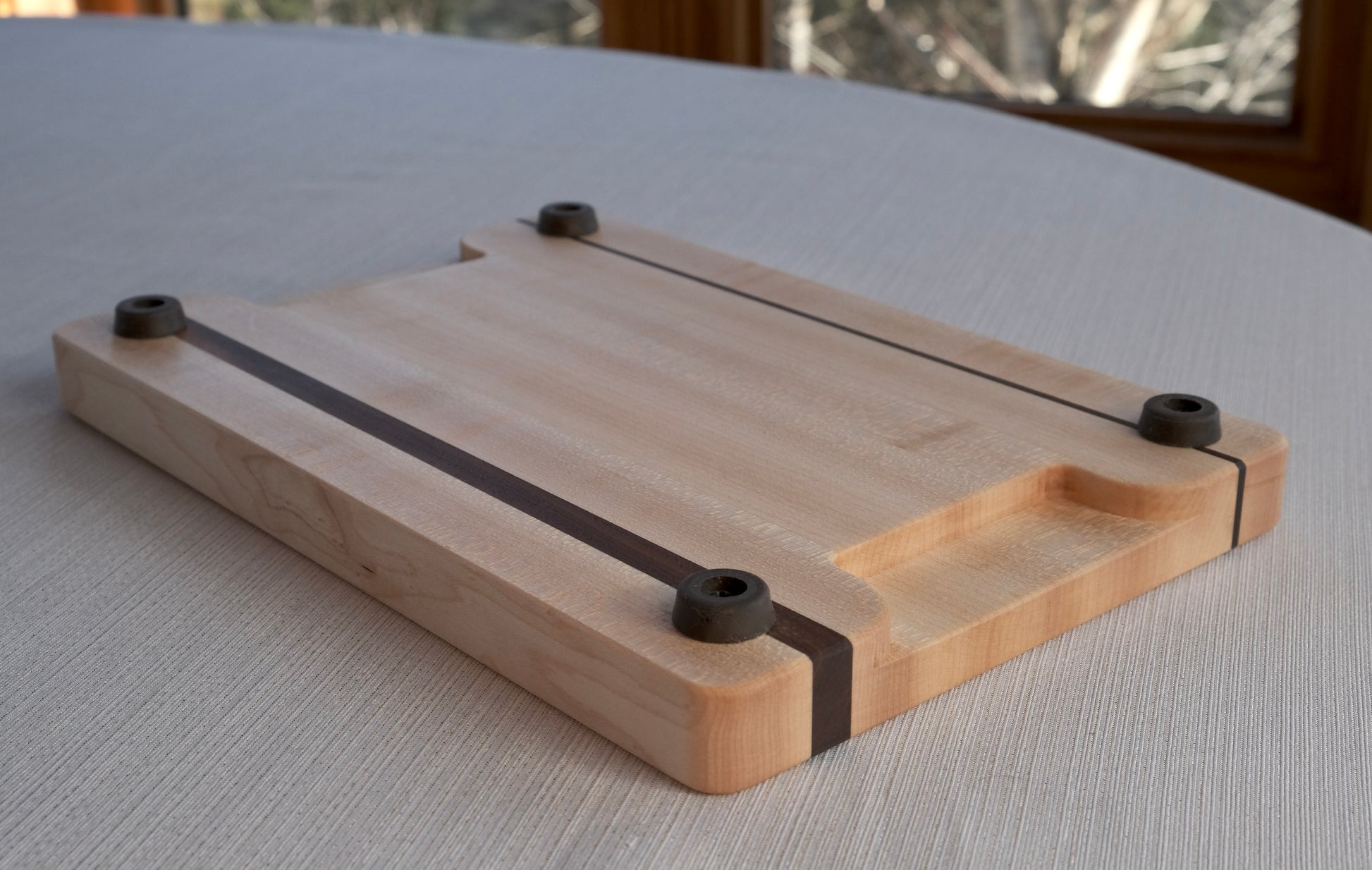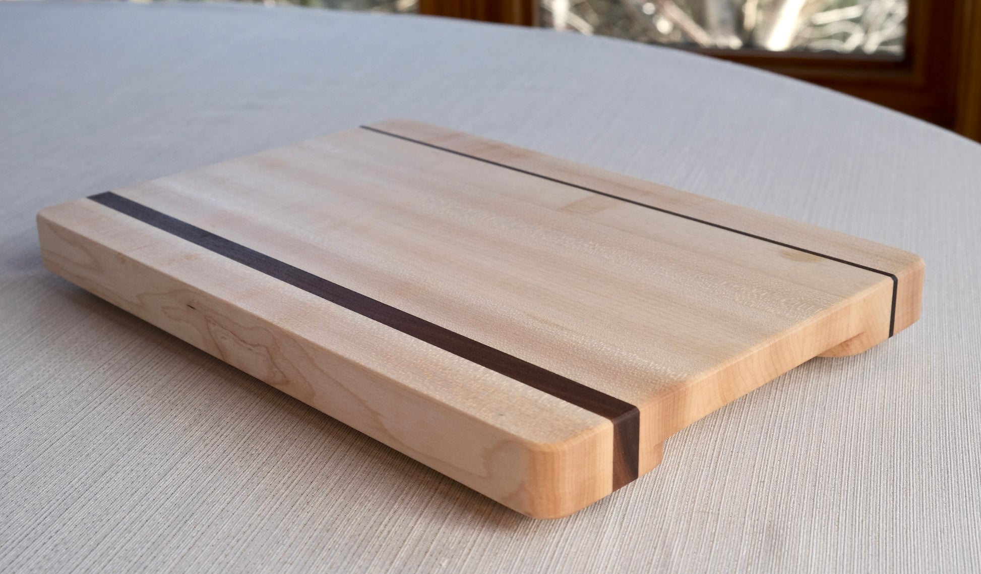 Petite planche à découper en bois d'érable avec des insertions en bois de noyer.