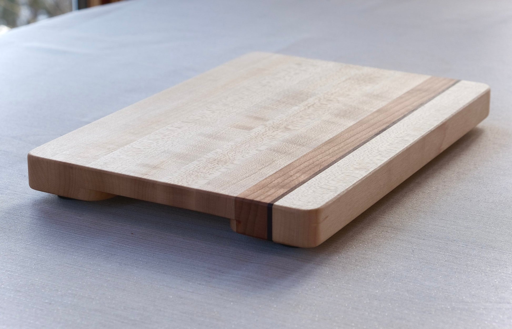 Petite planche à découper en bois d'érable avec des insertions en bois de noyer et de cerisier.