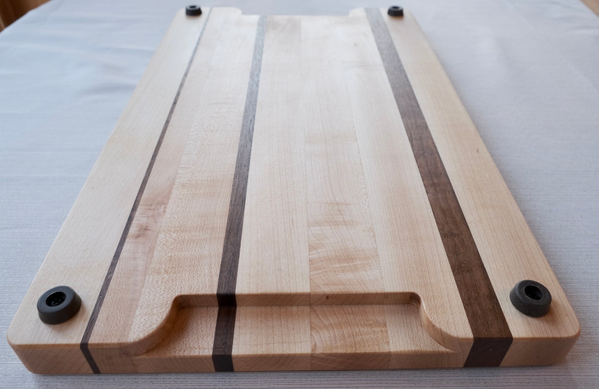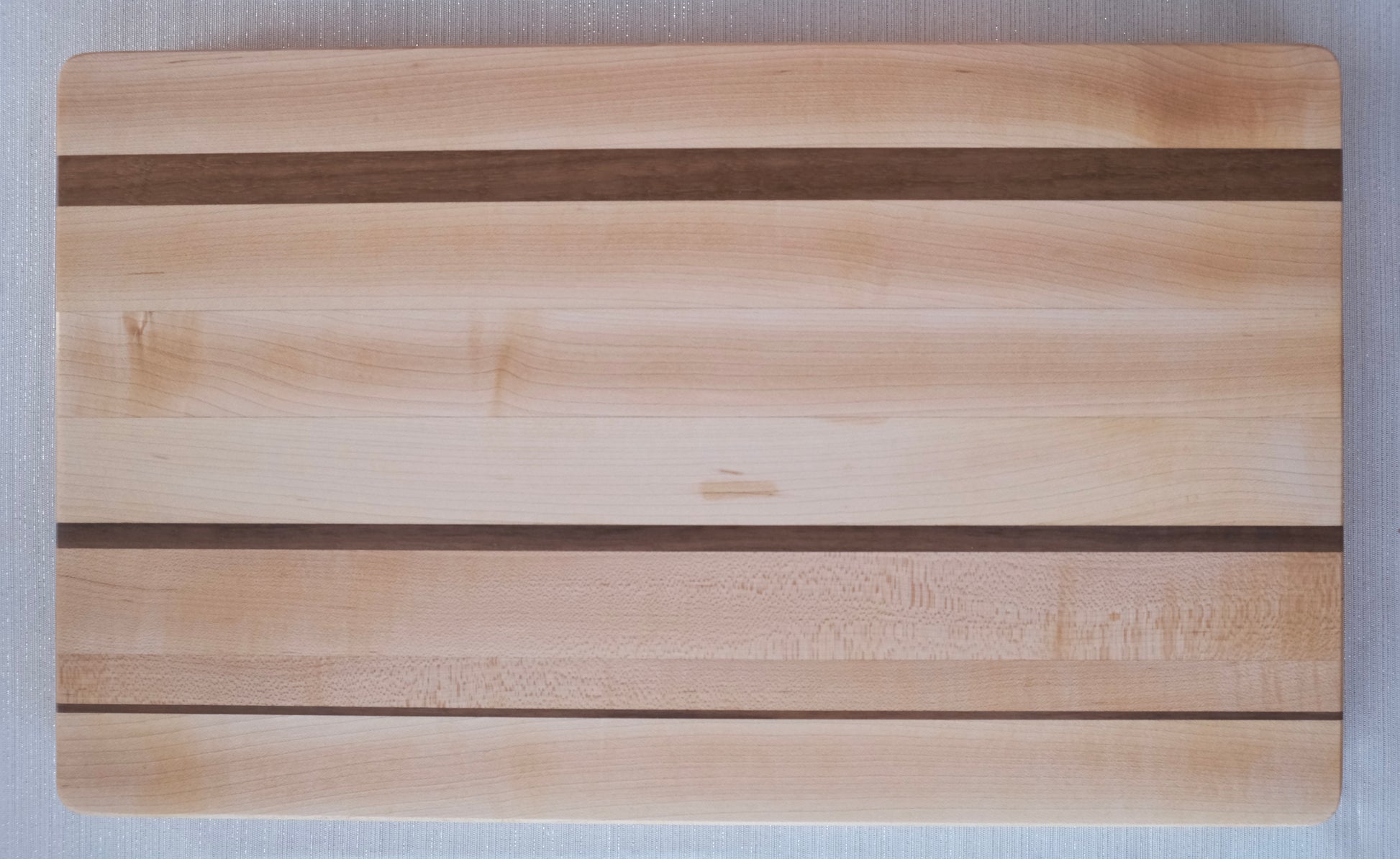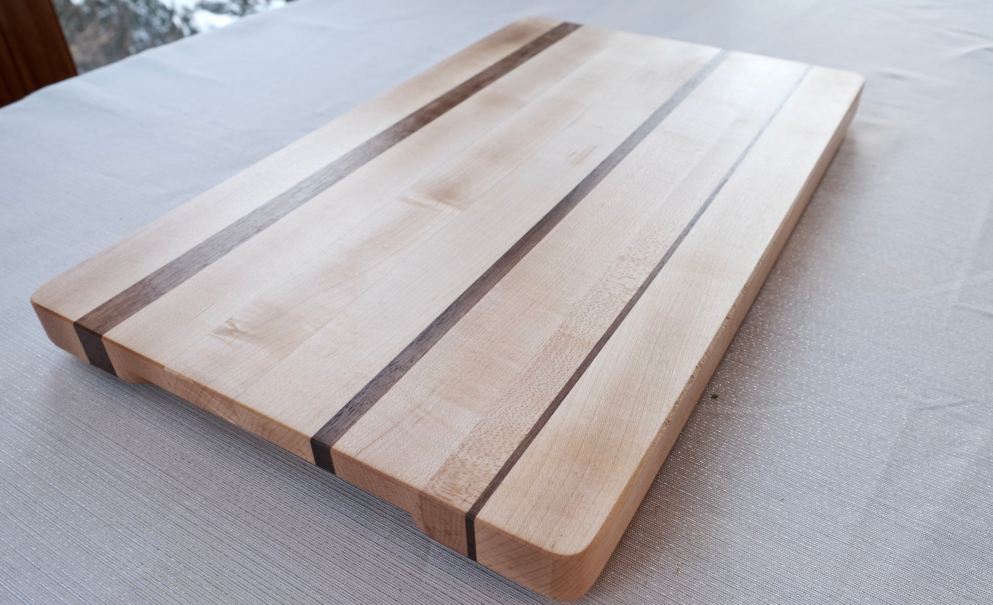 Planche à découper en bois d'érable avec des insertions en bois de noyer.